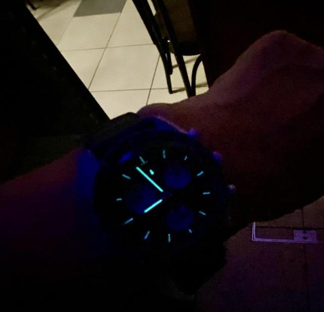 インデックスと分針・時針・クロノ針に蓄光塗料が塗られております。