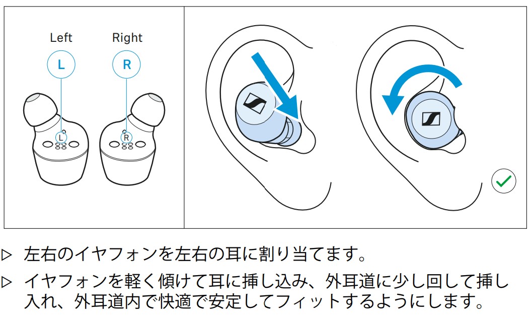 sennheiserの推奨取り付け方は、まず普通につけてからねじ込ませるというもの。これ、実際やると、密着感が半端ないです。
