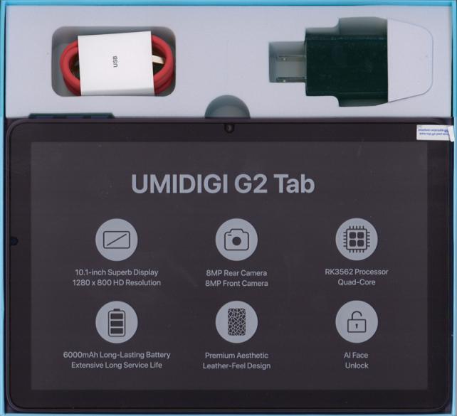 パッケージを開けると、上部には、充電用のUSB Type-A > Type-Cケーブルと5V2AのUSB ACアダプターが入っていて、下部には、個装箱裏面に記載されている商品の特徴が印字された保護カバーが付いた状態で、タブレット本体が入っていました。