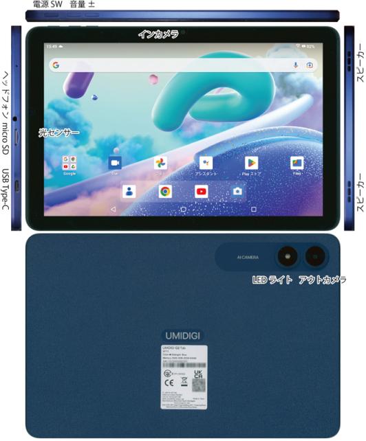 横向きをデフォルトとすると、パネル上部の中央には、8Mピクセルのフロントカメラ、パネル左側中央には光センサーが付いていて、予め液晶保護パネルが貼り付けてありました。