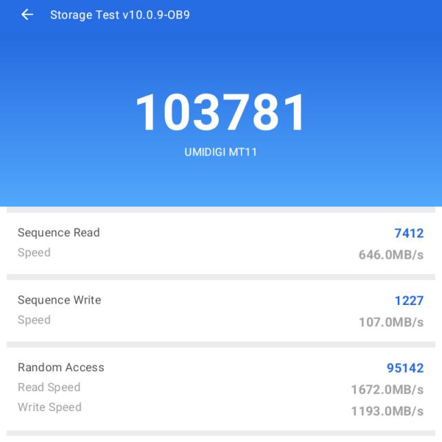 ストレージのベンチマークを走らせてみましたが、シーケンシャルリードで646MB/s、シーケンシャルライトで107MB/sなので結構高速なストレージを搭載しています。