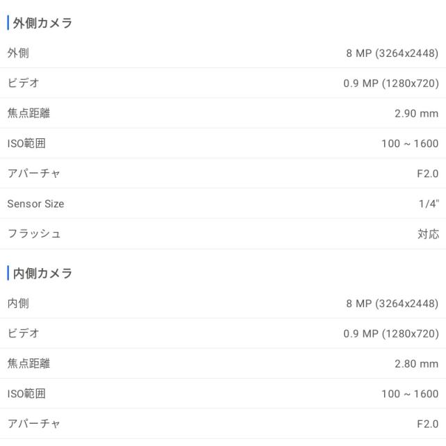 カメラは、内外共に8Mピクセル、レンズの焦点距離は、外カメラが2.9mm 内カメラが2.8mmで、ISOは共に100~1600迄で明るさは共にF2となります。