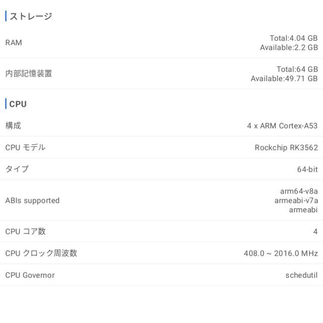 CPUは、ARMの64bit対応Cortex-A53の4コア構成です。