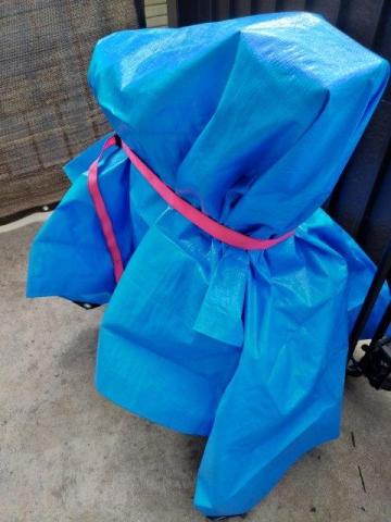 半分に折って車いすの上から被せ、ベルトで絞めれば