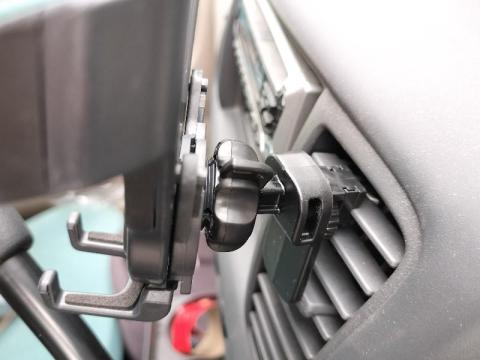 こいつはルーバーにアームを差し込むタイプなんですが、ダイヤルがついてて、写真の白い部分が動きます。差し込むだけだと前後に動いちゃいますが、これで締め付けることで固定できる。