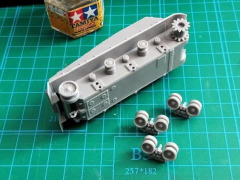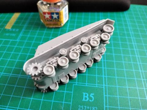 さらに、ここに履帯を巻くのが意外と大変でした。ゴム製だったんですが、別に車輪が回るわけでもないのに端を接着するだけの指示。でも接着するまで固定しないといけないのが難しく、だいぶ汚くなっちゃいました。