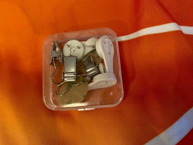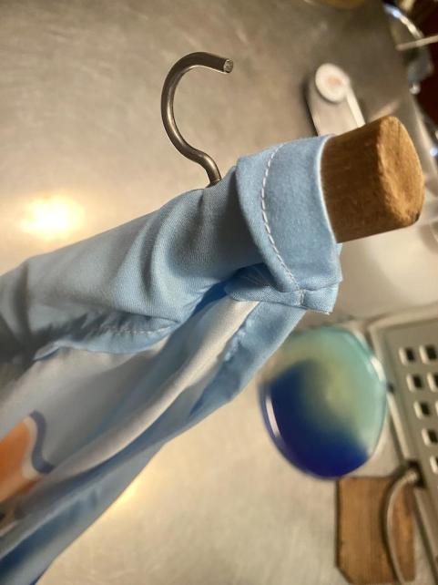 予てから使っている丸棒を通し、布ごと貫通させるカタチでフックを取り付けます。