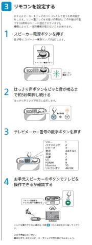 リモコン設定です テレビ側で使用していたリモコンでも以前と同じように動作します 地デジは設定どおりですが、BS/CSは再設定が必要かも 東芝のリモコンコードは5 , 6ありますが今回は6でした スピーカーは音声だけ利用しリモコンは従来のテレビリモコン使用が簡単かもしれないですね。