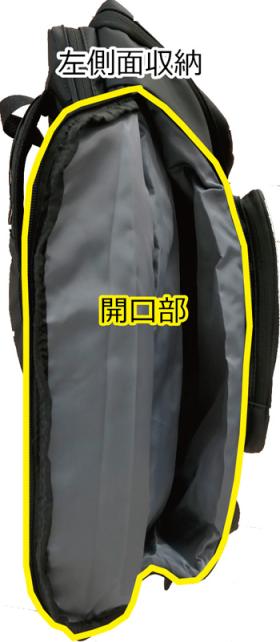 メイン収納は、左側チャックからからアクセスできる空間と収納空間をシェアすることになっりますが、左側からアクセスできる空間は、薄いナイロン製布で仕切られているだけなので、シェアの割合は、自由に配分することができます。