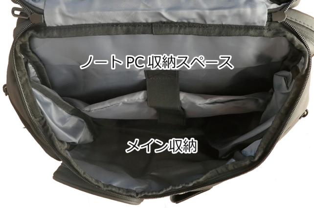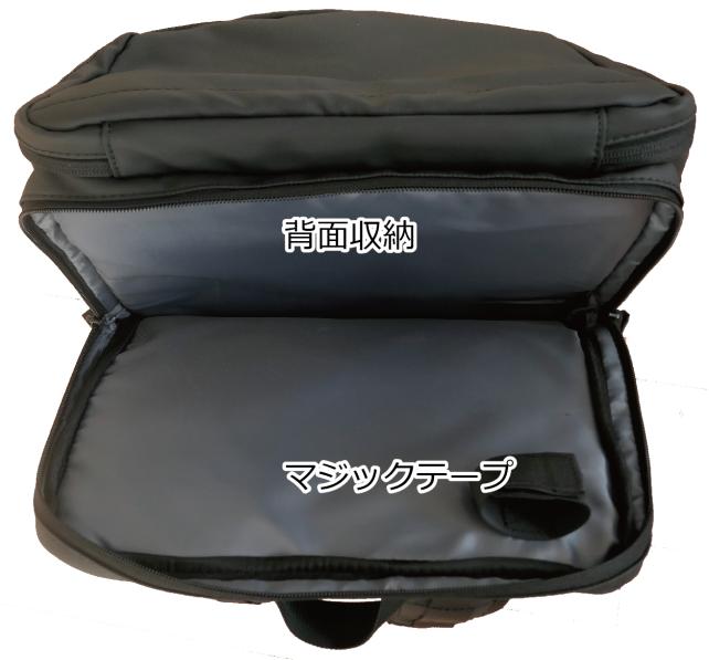 天面のジッパーを開けると、メイン収納があるのですが、背中側に、クッション性の仕切り板とマジックテープでノートPC等を収納することができます。