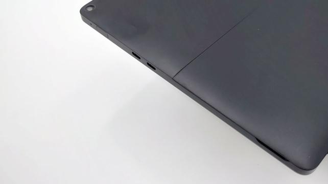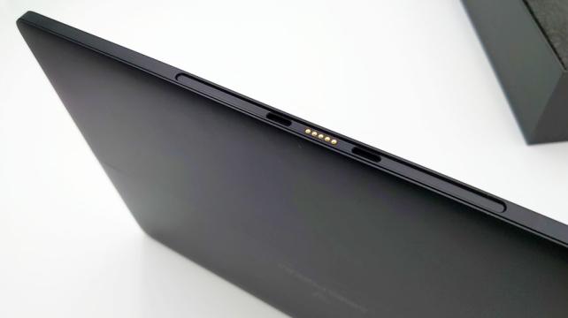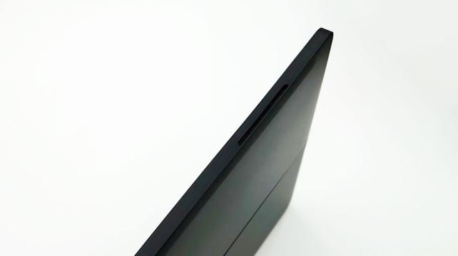 本体右側は、2個のThunderbolt 4、USB 3.2 Type-C 端子があります。薄型タブレットPCだと端子が少ないことが多いので素直に嬉しい。こちら側にはフラットになった部分に指紋認証ユニットを兼ねた物理電源ボタンがあります。