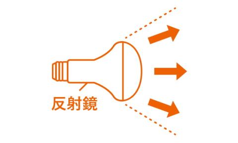 電球内部に反射鏡が取り付けられていて、四方八方に散らばってしまう光を1つの方向にまとめることで照射方向をより明るく照らすことができます。
