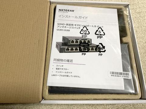 箱を開けるとまずインストールガイドが目に入ります、インストールガイドといってもアンマネージスイッチで説明する様な項目はほぼ無く、保証規定や仕様が記載されています。