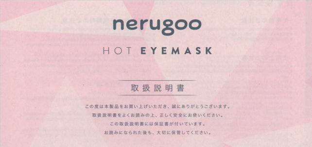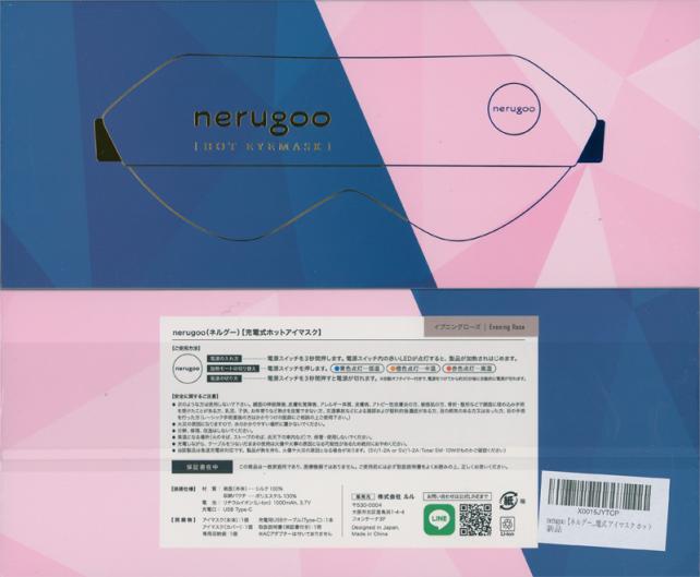 パッケージ表面は、紺とピンクのツートーンで構成され、商品の線画が描かれ、nerugoo HOT EYEMASKのロゴと商品名が印刷されています。