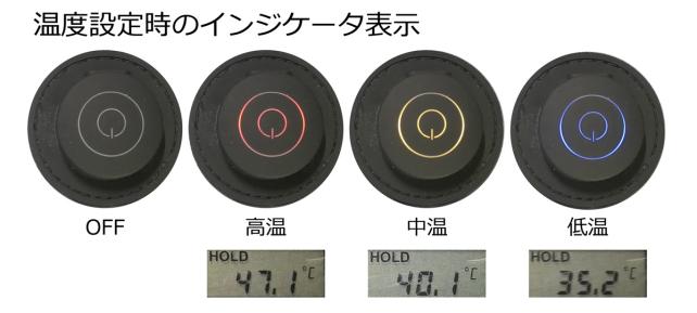 また、使用時には、コントローラのボタンを押す度に、赤(高温)>黄色(中温)>青(低温)>OFFと遷移します。