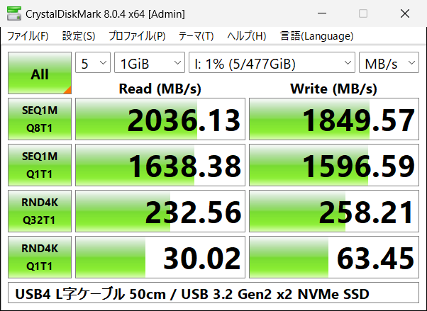 試しに、USB 3.2 Gen2 x2(20Gbps)対応のポータブルSSDを繋いで、DiskMarkを走らせてみました。