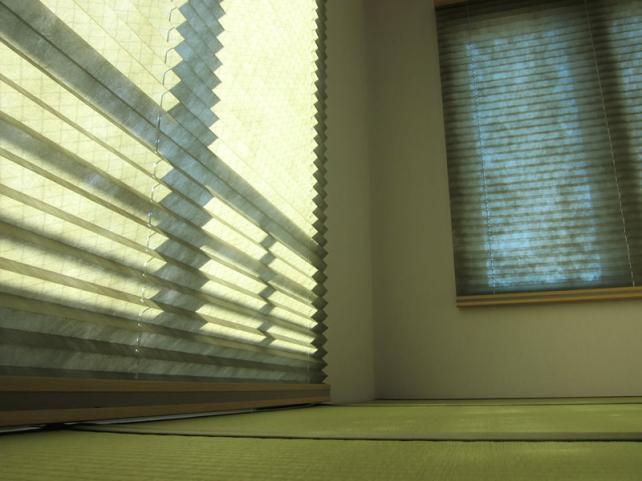畳の和室には障子にシャッターのような組み合わせが多いように思うのですが、和の雰囲気に合うのがこのプリーツスクリーンだと思います。