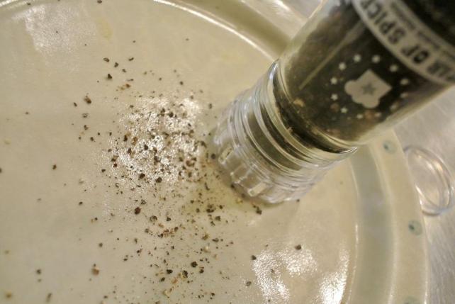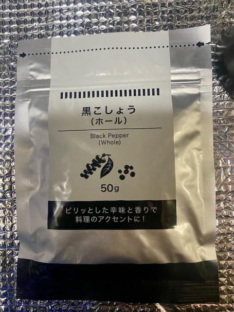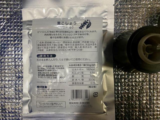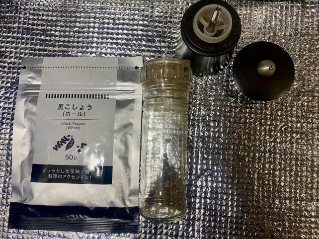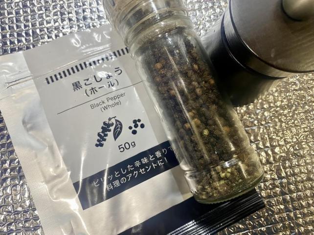 同じく業務スーパーで見つけた、透明ガラスボトル入りのミル付きブラックペッパーを買い求めると