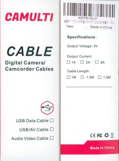 パッケージは、汎用のケーブル収納箱の様で、表面には、メーカーロゴとデジタルカメラ/カムコーダーケーブルという文字と、USBケーブル,AVケーブルという文字がチャックボックスと共に記載されています。
