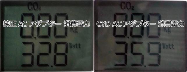 純正のACアダプターの消費電力が、32.8Wだったのに対して、このACアダプターは、35.9Wでした。