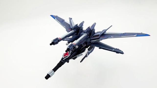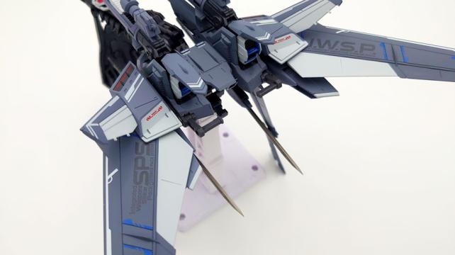 ウイングも大きく、落ち着いたグレーの彩色も平気っぽくて重厚感があります。複雑なラインの翼のシルエットも美しく、この兵装での空戦能力はどんなだろうと夢も広がります。