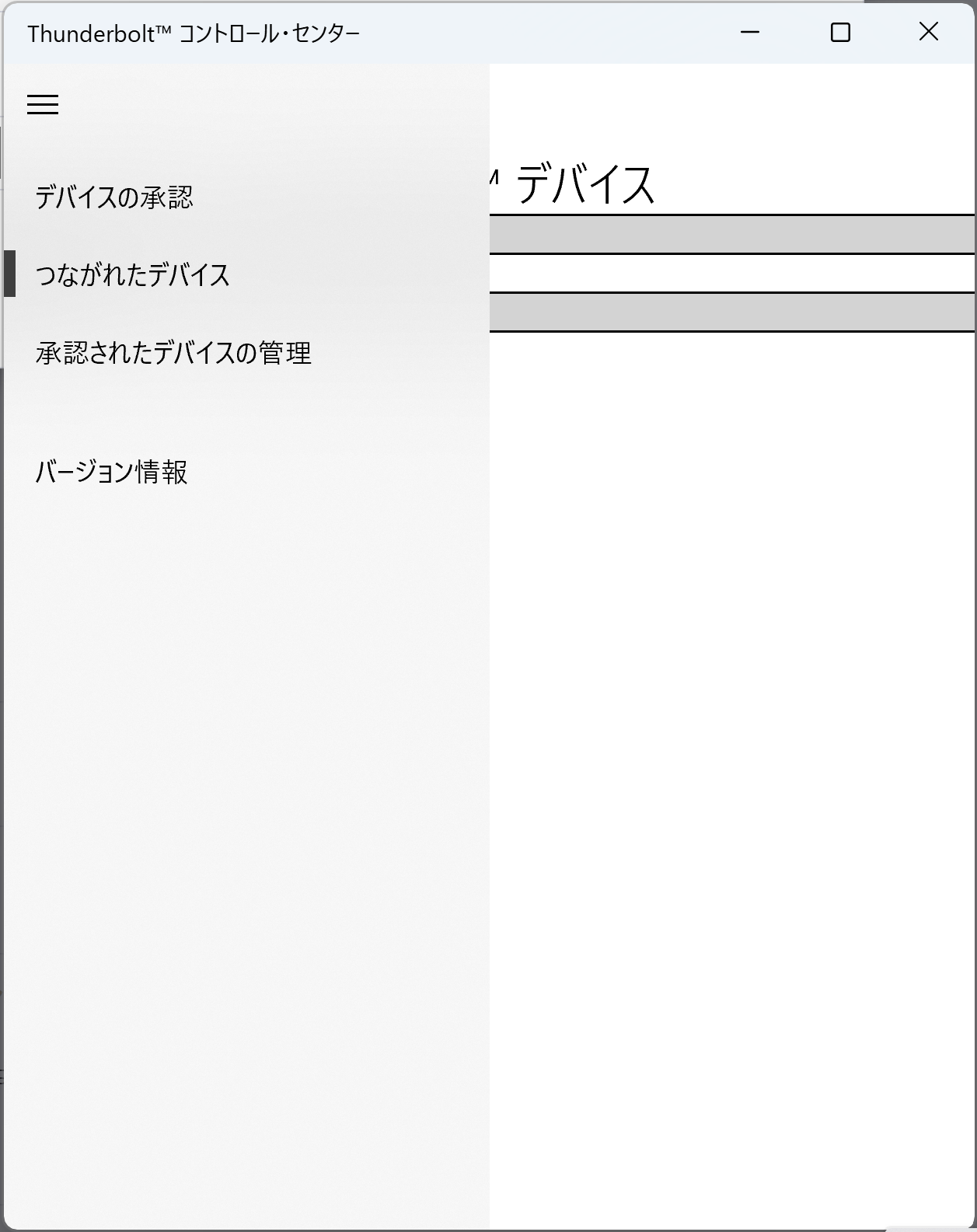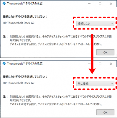 もう一枚の画像は昔のバージョンの画像なのですが、Thunderboltデバイスの承認設定がデフォルト値が「接続しない」になっていて、それを「常に接続」にすると繋がるなどということもありました。
