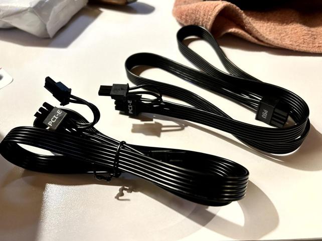 今までCPU8ピンしか挿せなかったのでマザーのコネクタに全部挿せたのは精神衛生上好ましいですね。あまり意味は無いのかもしれませんが。決してしなやかなケーブルではないですが細い、と言うか平たいのでケースの狭い隙間に通せるのはナイス!
