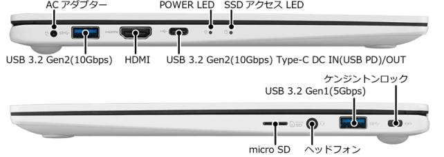私が使用しているノートPCには、USB type-C(10Gbps)x1,USB Type-A(10Gbps)x1,USB Type-A(5Gbps)x1,micro SD Slot,ヘッドフォンx1,HDMI出力x1が備わっています。