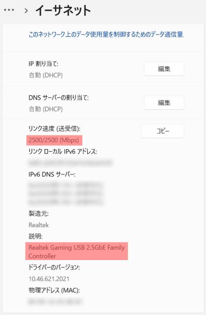 デバイスマネージャーに表示されたように、Realtek製の2.5Gbpsのイーサネットコネクターで、ネットワークのプロパティを見てみると、上りも下りも2500Mbpsで接続できていることを確認できました。