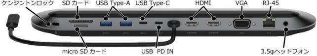 裏面には、左から、ケンジントンロック用穴、SDカードスロット、micro SDカードスロット、USB Typw-A x2、USB Type-C、USB PD IN、HDMI x2、VGA、イーサネットコネクター(RJ-45),ヘッドフォン端子が並んでいて、中央から、350mmのUSB Type-Cケーブルが直出しになっています。