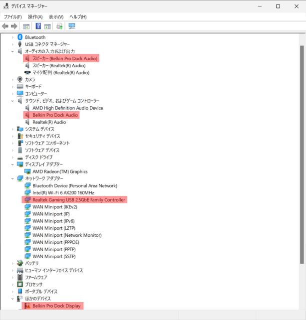 このドッキングステーションをPCに接続すると、 Belkin Pro Dock Audio、Realtek Gaming 2.5GbE Family Controllerのデバイスが追加され、Belkin Pro Doc Displayが正常に認識されませんでした。