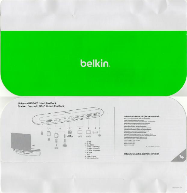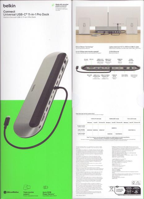 パッケージ表面は、鮮やかなグリーンとホワイトの2トーンパッケージで、商品イメージが中央に印字され、底部には、メーカーロゴと、Universal USB-C 11-in-1 Pro Dockと記載されていて、下部には、ピクトグラムと共に、トリプルディスプレイ対応、USB PD 100W対応であることが記載されています。