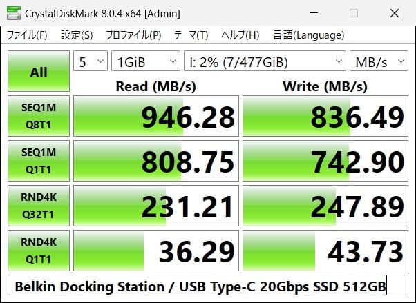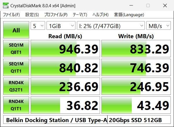 このドッキングステーションのUSB Type-Cポートには、10Gbpsの記載がありますので、USB Type-Aと同様の環境でDiskMarkを走らせてみました。
