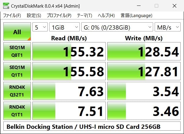 パッケージに、Up to 160MB/sと記載されたmicro SDカードを挿して、DiskMarkを走らせてみました。