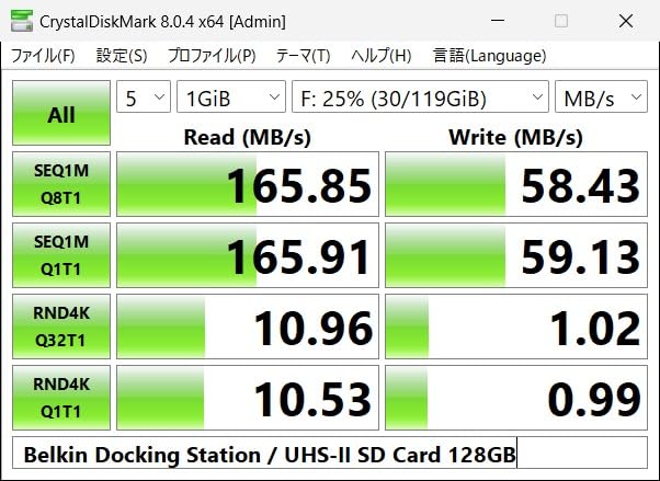 手元にあるUHS-II仕様のSDカードは、上限150MB/sのカードですが、このカードを使って、DiskMarkを走らせてみました。
