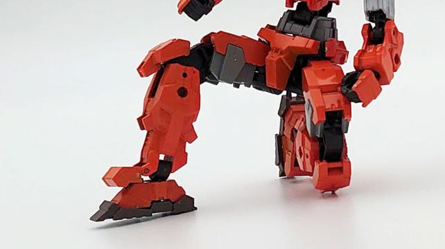 この 30mm の売りは簡単に組み立てられるというところですが、かなり自由に動いてポーズを付けられるというのもポイントです。両足の設置が特に優秀で、ガバッと股を開き、つま先を外側に向け、威嚇するように立つ「カトキ立ち」すら自由自在。この状態で放り投げても自立するくらいバランス力と関節保持力に優れています。