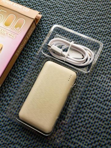 普通のモバイルバッテリーです。2500mAh充電のようですが、「Redmi 12C」は5,000mAhなので半分の容量・・・。