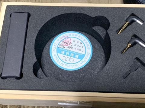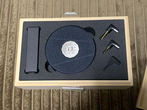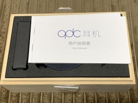 蓋を開け冊子類を取り出すと、目に入るのはqdcロゴ付きの布製セミハードキャリングケースと黒い紙製小箱、4.4mmプラグと2.5mmプラグが並んでいるところです。