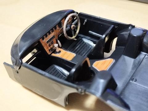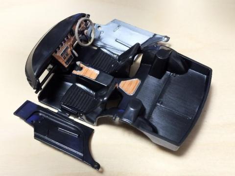 スナップなところは内装で、ダッシュボードやシートが折り込んでつなげるだけでできてしまいます。頭いい。このパーツの外側だけ切り取ってデカールを貼って折り込むと…