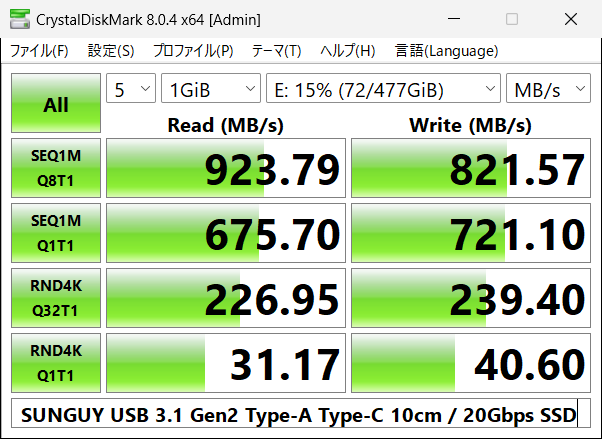 冒頭に記載したように、20Gbps対応のUSB SSDを接続して、DiskMarkを走らせてみました。