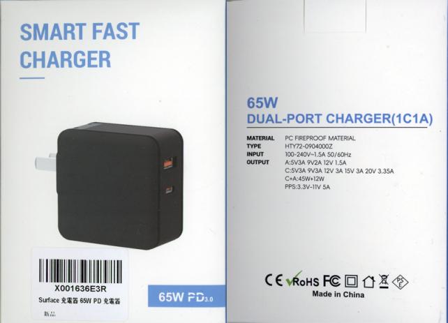 パッケージは、白バックにUSB充電器の写真が中央に印刷されていて、SMART FAST CHARGERという名称が印字されていて、パッケージ下段右には、65W PD 3.0の記載があります。