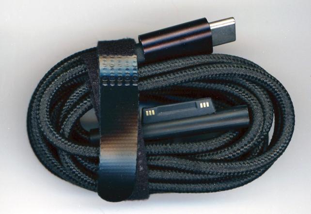 Surface Laptop 2に標準添付の純正ACアダプターは、一般的なノートPC用ACアダプターに似た形状で、USB Type-A(5V/1A)の充電出力を備えていて、重量は、付属のメガネケーブルを含んで、224gあります。