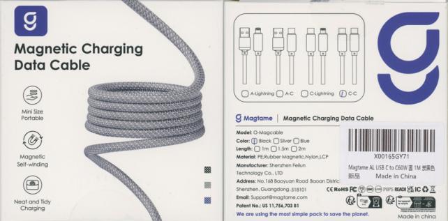 パッケージ表面は、白バックに、ケーブルがまとまっている写真が大きく印刷されていて、上部には、メーカーロゴと共に、Magnetic Charging Data Cableという名称が印字されています。