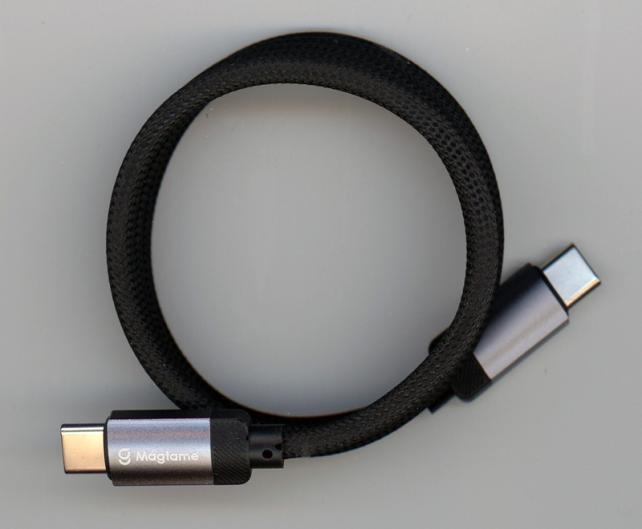 このケーブルの最大の特徴は、ケーブル自体が磁気を帯びているので、直径60mm程度の円に丸めても、磁気の力で固着するので、ベロクロ等で止める必要がありません。