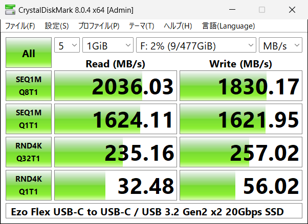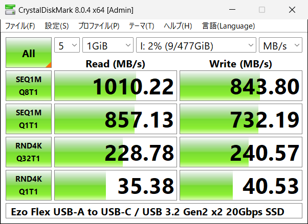 20Gbps対応の、USB SSDを接続して、DiskMarkを走らせて確認しました。