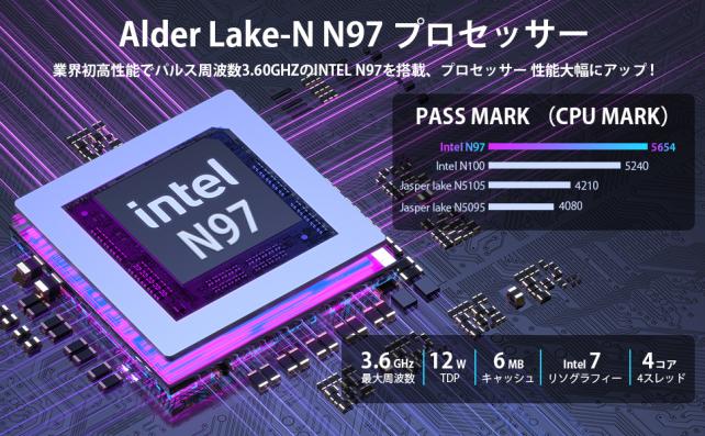 CPU:第12世代 Alder Lake-N N97 (3.60GHz、6Mキャッシュ、4コア4スレッド、HTなし)