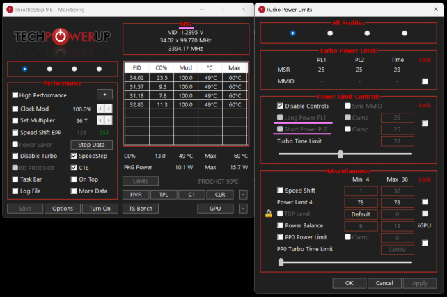 Power Limit(PL1)の電力上限値。性能は100%出ている!