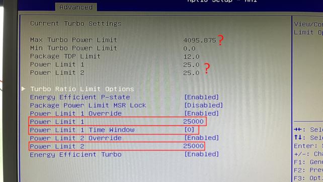 結論から言うとPL1、PL2ともにロックされていて変更不可でBIOSで設定されてる25Wでした。