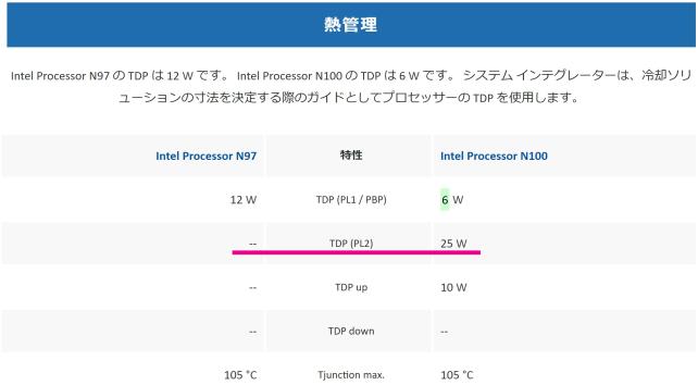 なお、N100 CPUのPL2の値が25W。N97も同じ系列だから同じ25Wと仮定。