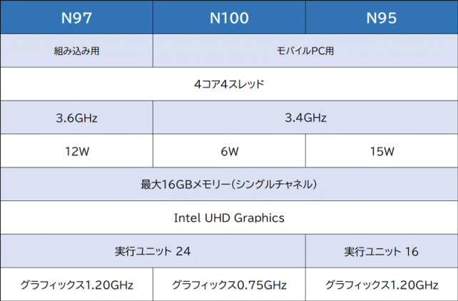 GPU:Intel UHD (24EU / up to 1.2 GHz) ※N100だとIntel UHD (24EU / up to 750 MHz)
